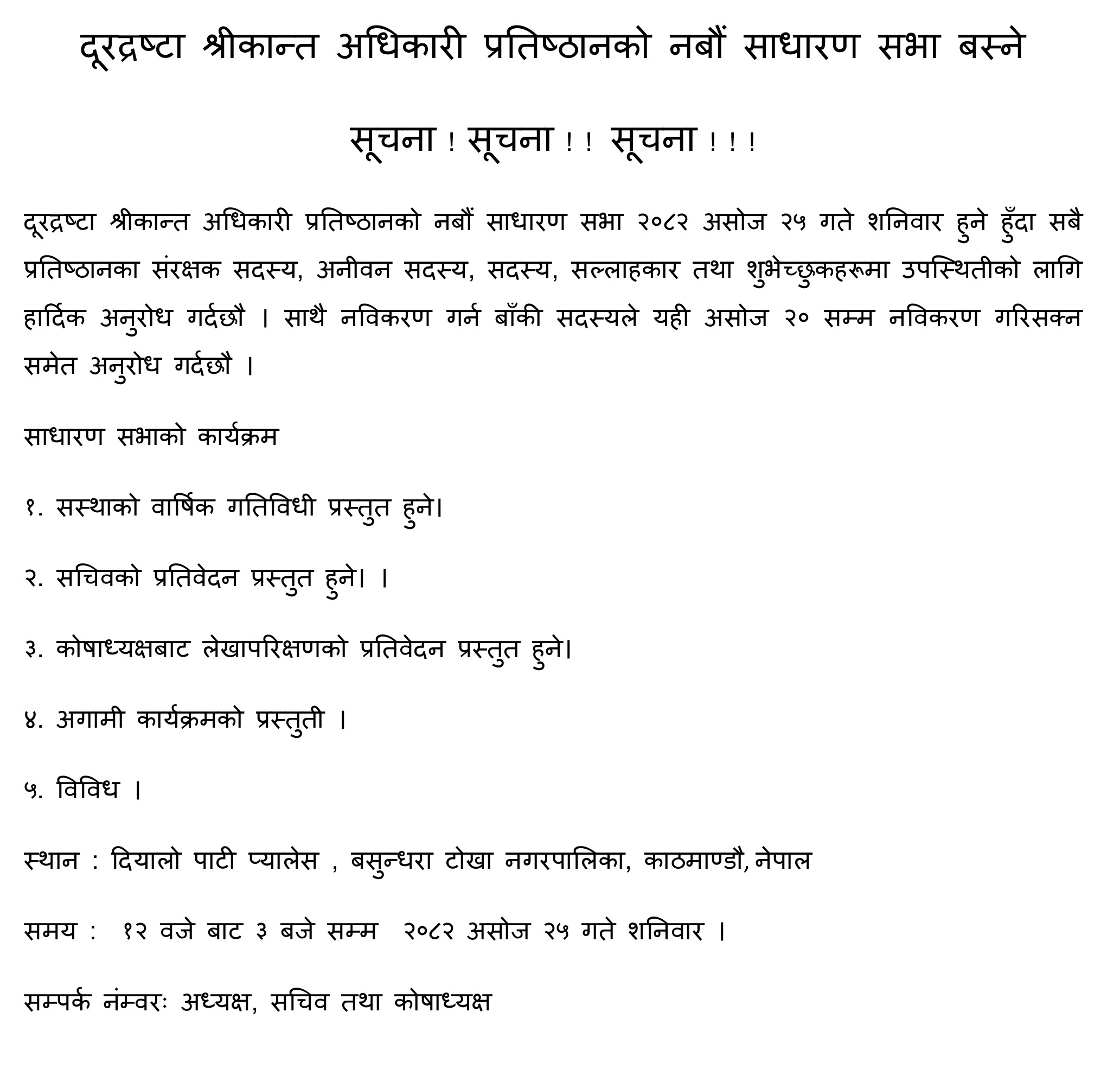 दूरद्रष्टा श्रीकान्त अधिकारी प्रतिष्ठानको नबौं साधारण सभा बस्नेसूचना ! सूचना ! ! सूचना ! ! !दूरद्रष्टा श्रीकान्त अधिकारी प्रतिष्ठानको नबौं साधारण सभा २०८२ असोज २५ गते शनिवार हुने हुँदा सबै प्रतिष्ठानका संरक्षक सदस्य, अनीवन सदस्य, सदस्य, सल्लाहकार...